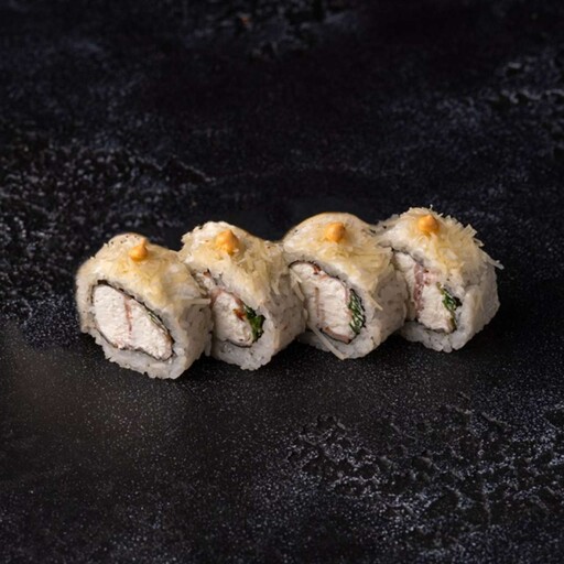 Рис, нори, сыр творожный, огурец, бекон, пармезан, спайси соус.