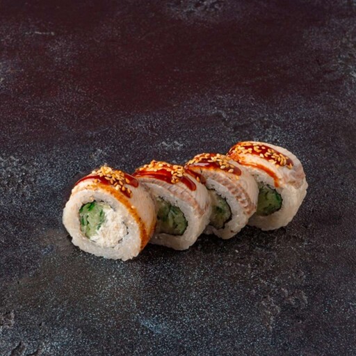 Рис, нори, творожный сыр, огурец, угорь, унаги соус, белый кунжут