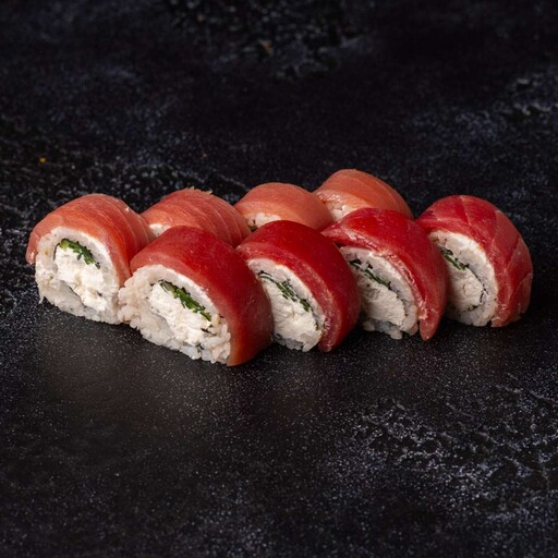 Рис, нори, сыр творожный, жаренный лосось, красная масаго, огурец, стружка тунца