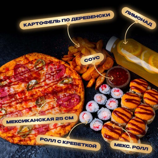 🥢 Ролл Мексиканский 8 шт. 330 г., Ролл с креветкой 8 шт 123 г.., Пицца Мексиканская 25 см 330 г., Картофель по-деревенски 1 шт. 150 г., Кисло-сладкий чили соус 1 шт., Лимонад Цитрус-персик 0.45 л., произвольно. 👥 на 2-3 персоны