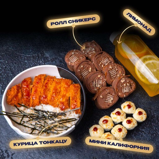 🥢 Курица Тонкацу 1 шт. 220 г., Ролл Сникерс 8 шт. 210 г., Мини калифорния запеченная 8 шт. 158 г., Лимонад Цитрус-персик 0.45 л., произвольно. 👥 на 1 персону