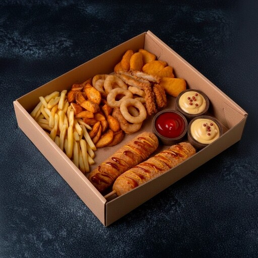 🥢 Два корн-дога, Картофель фри, Курица тонкацу, Картофель по-деревенски, Наггетсы хрустящие, Луковые кольца, Сырный и кисло-сладкий соусы