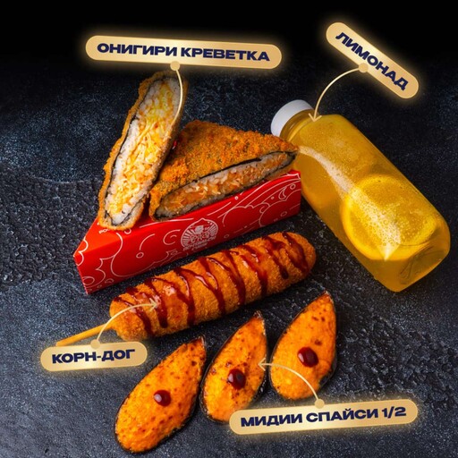 🥢 Корн дог с сосиской 1 шт. 210 г., Жареный онигири с креветкой 2 шт. 260 г., 1/2 Запеченные мидии со спайси соусом 3 шт., Лимонад Цитрус-персик 0.45 л., произвольно.