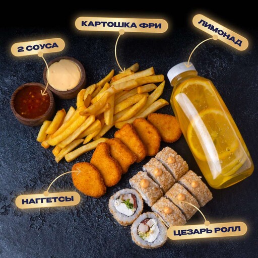 🥢 Наггетсы куриные 6 шт. 130 г, Картофель фри 1 шт. 150 г., Цезарь ролл 8 шт. 240 г., Сырный соус 1 шт., Кисло-сладкий соус 1 шт., Лимонад Цитрус-персик 0.45 л, произвольно.