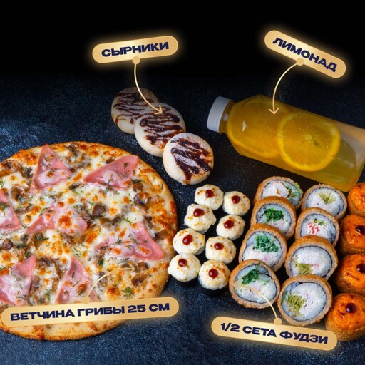 🥢 1/2 Сет Фудзи 20 шт. 475 г., Сырники с шоколадом 3 шт. 170 г., Пицца Ветчина-грибы 25 см 437 г., Лимонад Цитрус-персик 0.45 л., произвольно.