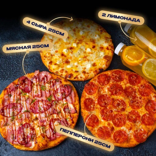 🥢 Пицца Мясная 25 см 469 г., Пицца Пепперони 25 см 425 г., Пицца 4 сыра 25 см 470 г., Лимонад Цитрус-персик 0.45 л, произвольно 2 шт.