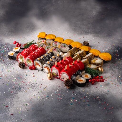 🎄Фирменный Новогодний сет с морским характером! Свежий лосось с лёгкой сладостью мандарина, нежный кальмар и снежный краб, креветка и хрустящая чука. Каждый ролл дарит чистый морской вкус и создаёт праздничное новогоднее настроение.
