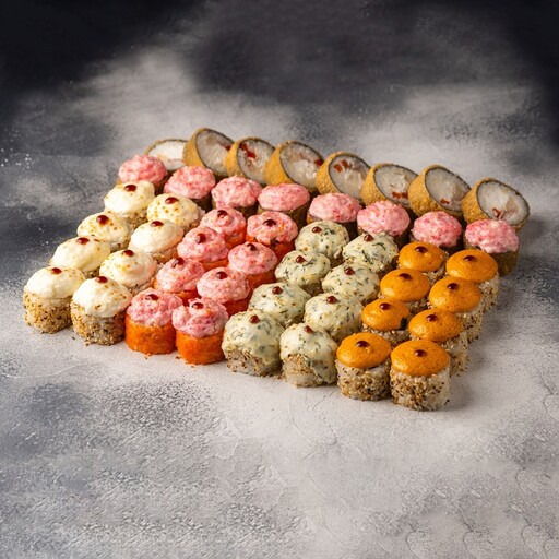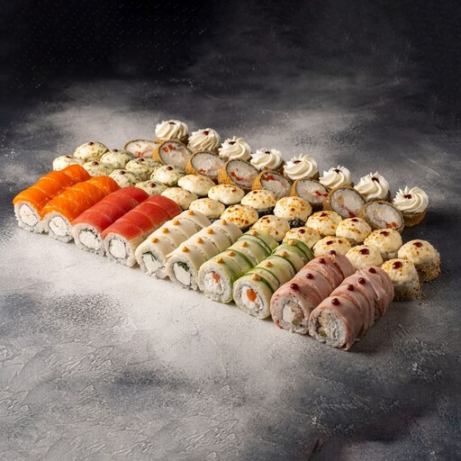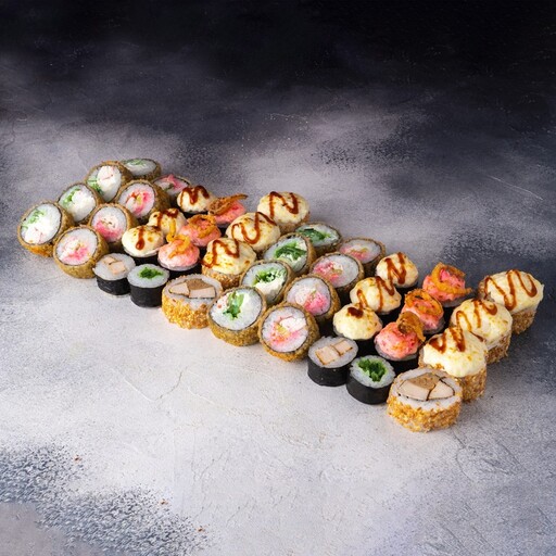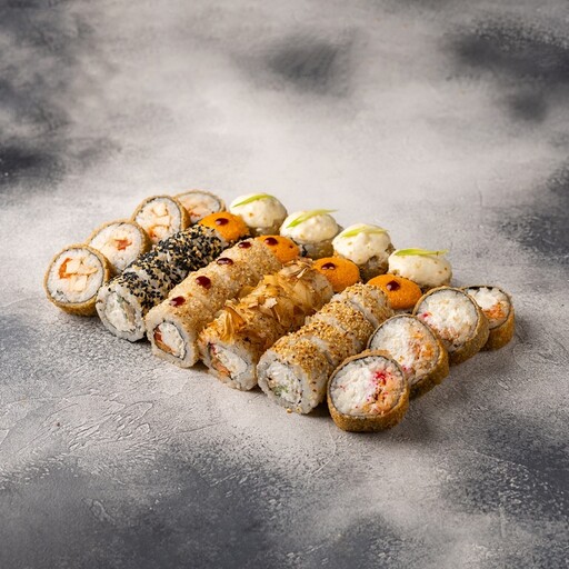 🥢 Дабл чиз классический 8 шт., Эби темпура 8 шт., Аргентина 8 шт., Краб мини 8 шт., Калифорния мини 8 шт., Мидии-мини 8 шт.