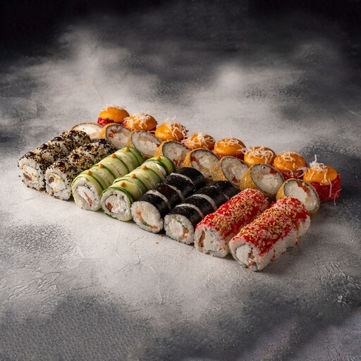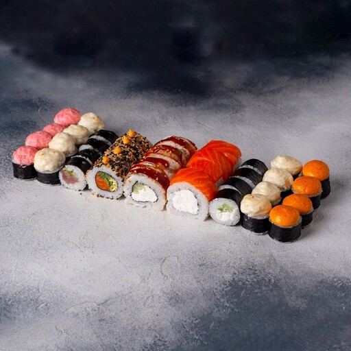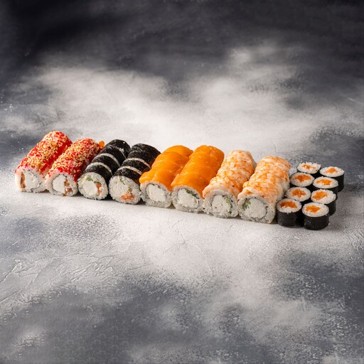 🥢 Филадельфия с креветкой 4шт., Эби классик 4шт., Цезарь ролл 4шт., ролл с Тунцом и огурцом 4шт., Калифорния мини 4шт., Грибы терияки мини 4шт., Мидии мини 4шт., Лосось мини 4шт., Капа чиз 4шт.