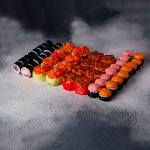 🥢 Red темпура 8 шт., Кани темпура 8 шт., Калифорния запеченная 8 шт., Спайси теплый 8 шт., Осака 8 шт., Филадельфия 8 шт., Дабл чиз мини 8 шт., Ролл с огурцом 8 шт.