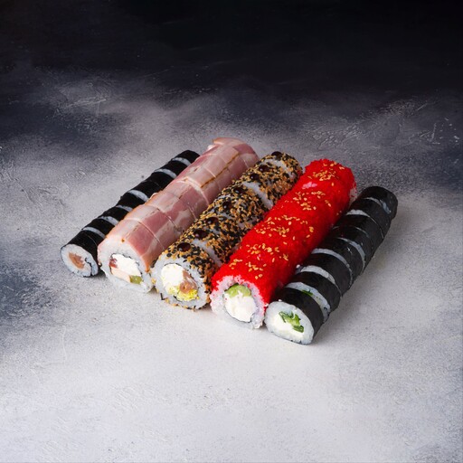 🥢 Дабл чиз классический 4 шт., Венера 4 шт., Хоукай 4 шт., Наоми 4 шт., Калифорния запеченная 4 шт., Филадельфия с креветкой 4 шт., Филадельфия с тунцом 4 шт., Сливочный ролл с тунцом 4 шт., Грин ролл 4 шт., Дон-бекон 4 шт.