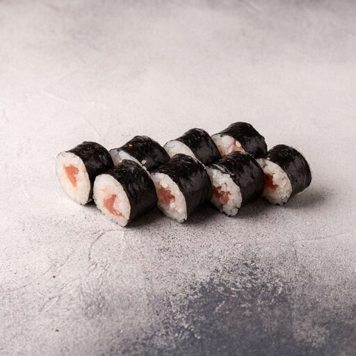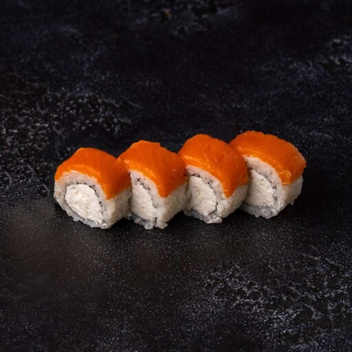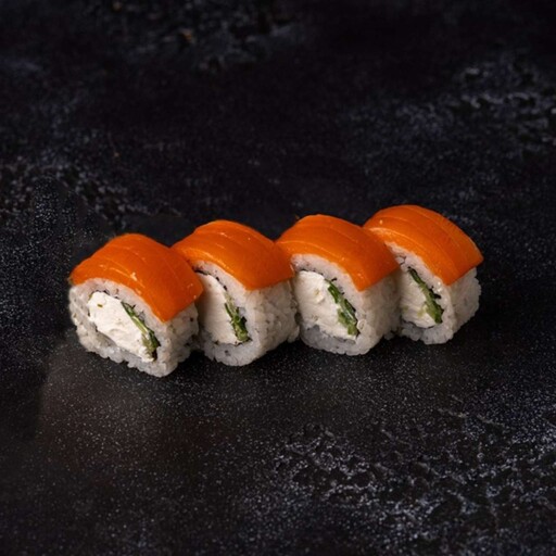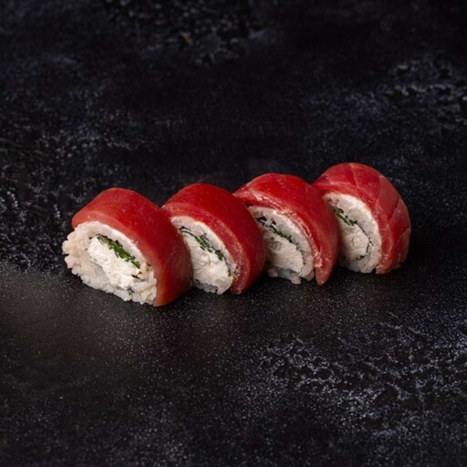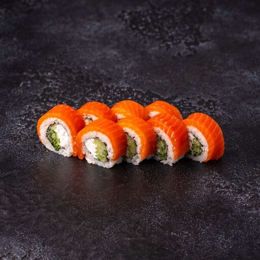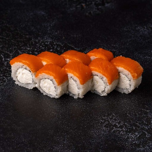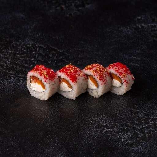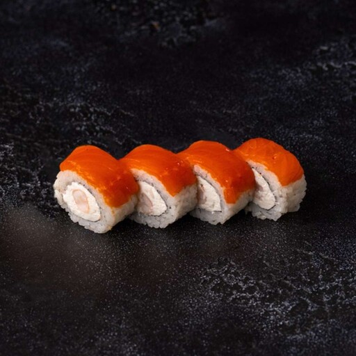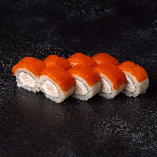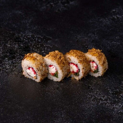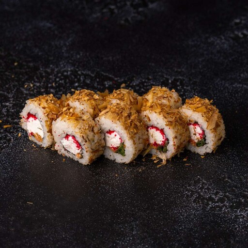 Рис, нори, сыр творожный, жаренный лосось, красная масаго, огурец, стружка тунца
