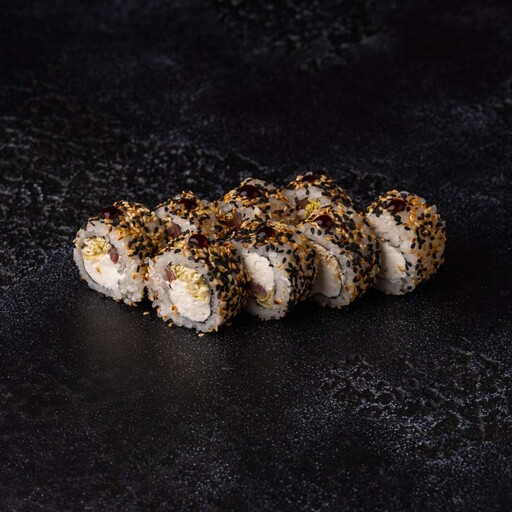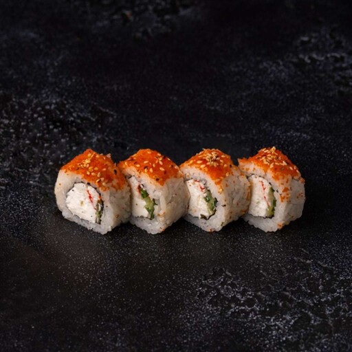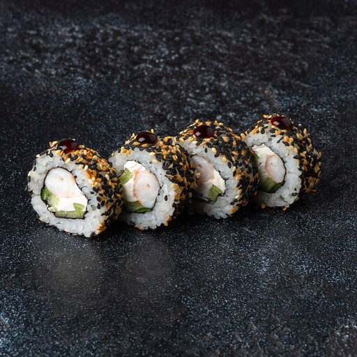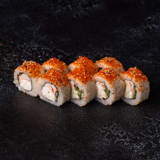 Рис, нори, сыр творожный, краб, огурец, масаго, кунжут