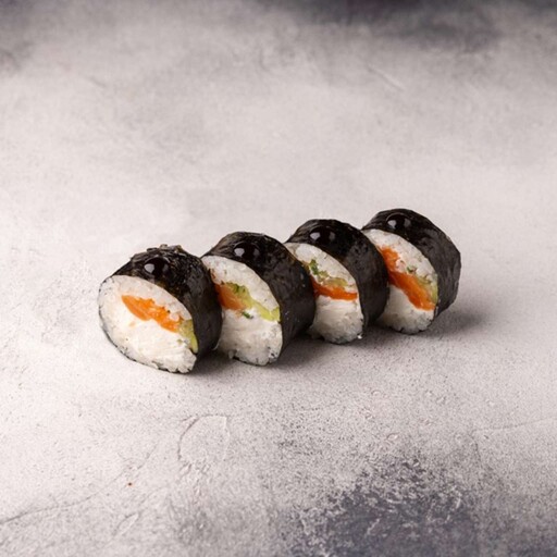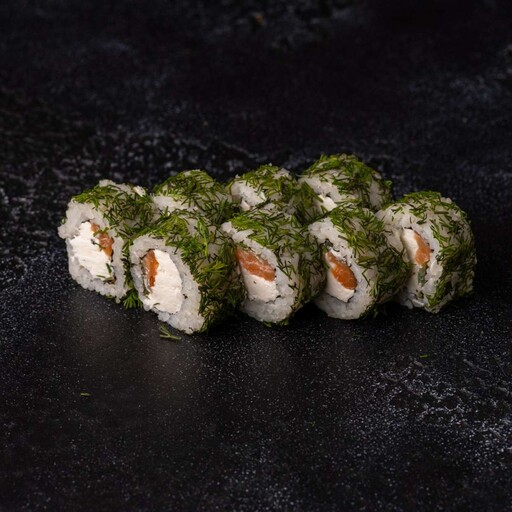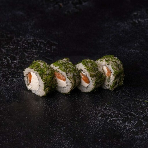Рис, нори, сыр творожный. лосось, огурец, укроп