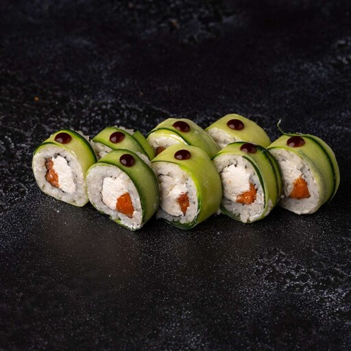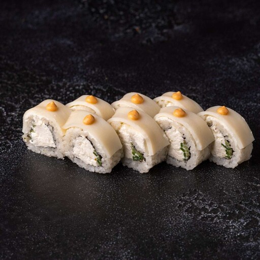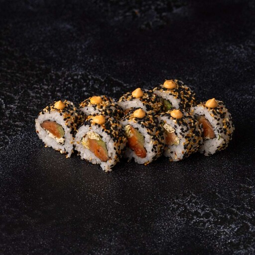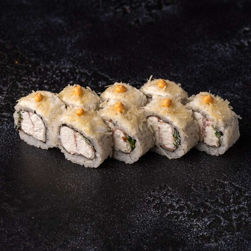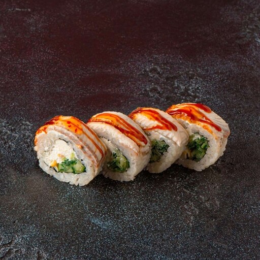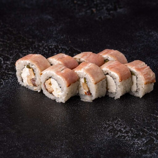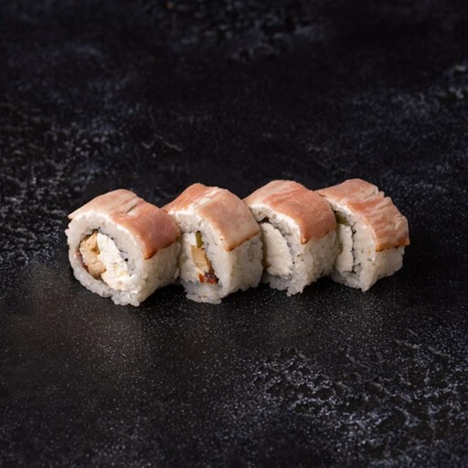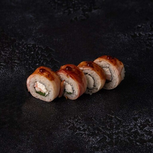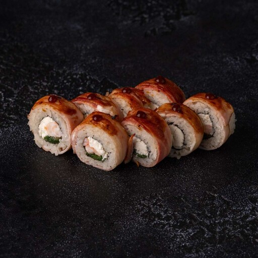 Рис, нори, сыр творожный, огурец, бекон, пармезан, спайси соус.