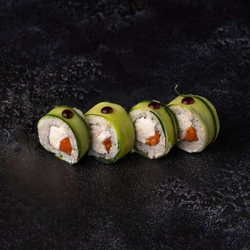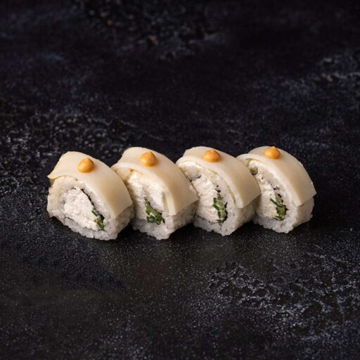 Рис, нори, сыр творожный, огурец, кальмар, спайси соус