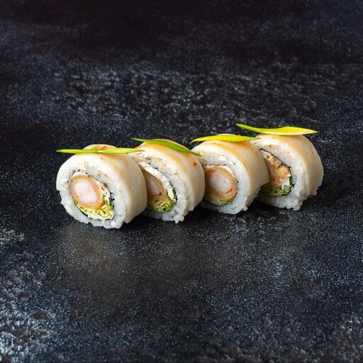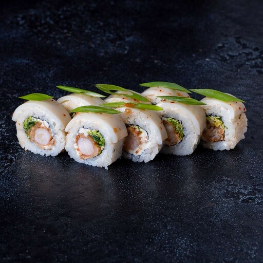 Рис, нори, творожный сыр, арахис, зелёный лук, креветки, кляр, панко, кальмар, кисло-сладкий соус, лук перо