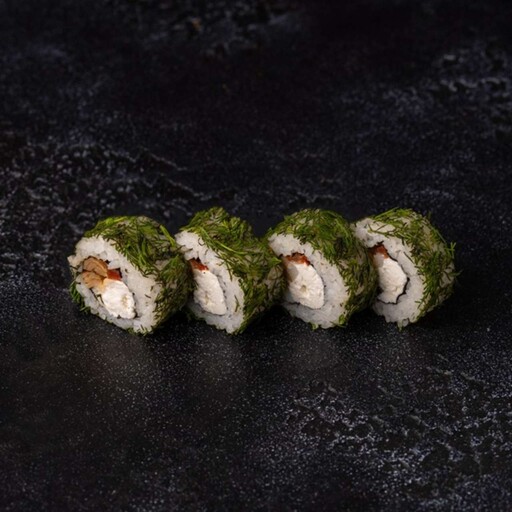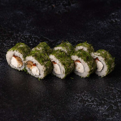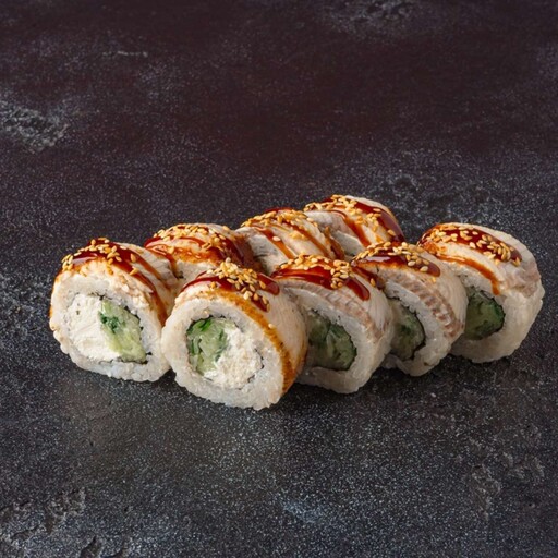 Рис, нори, творожный сыр, огурец, угорь, унаги соус, белый кунжут
