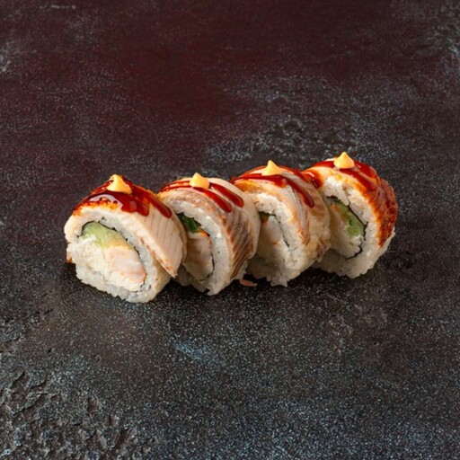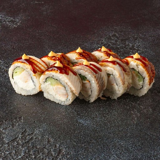Рис, нори, креветки, огурец, творожный сыр, угорь, унаги соус, спайси соус