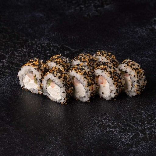Рис, нори, сыр творожный, креветка, огурец, кунжут