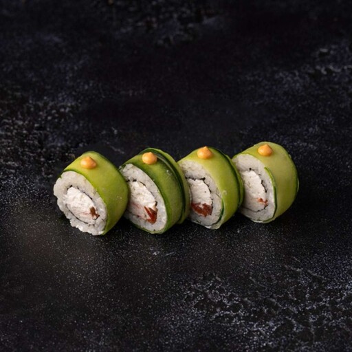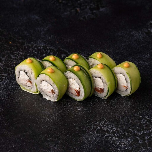 Рис, нори, огурец, кальмар, творожный сыр, угорь, кисло-сладкий соус, унаги соус