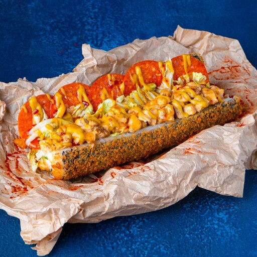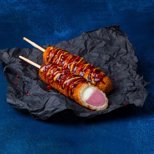 Сосиска, моцарелла, кляр, панко, унаги, горчица, кисло-сладкий соус.