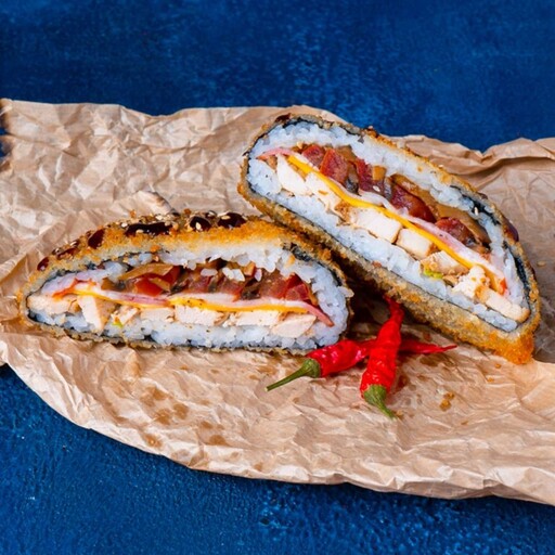 Рис, нори, курица, бекон, сыр чеддер, томат, грибы терияки, кляр, панко, BBQ соус, кунжут