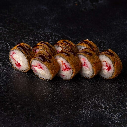 Рис, нори, кляр, панко, сыр творожный, масаго, креветка, унаги соус, кунжут