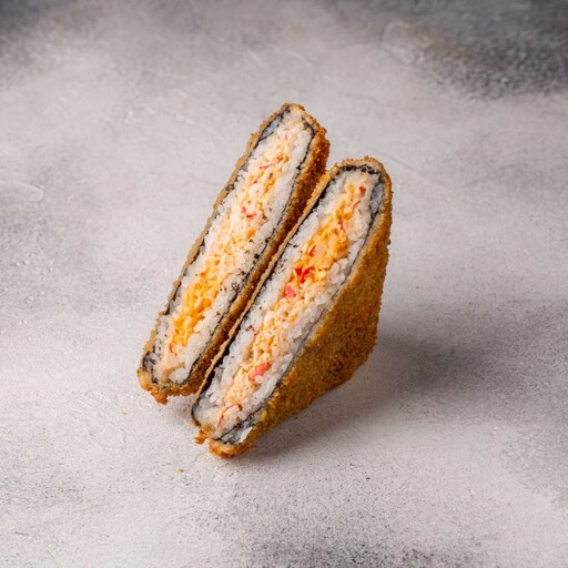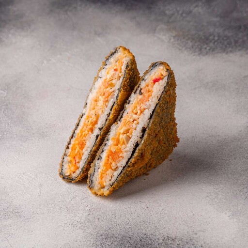 Рис, нори, кляр, панко, лосось, краб, спайси соус, унаги соус, кунжут.