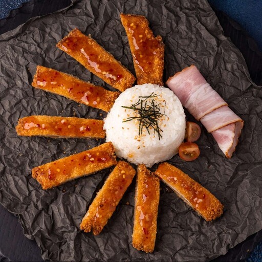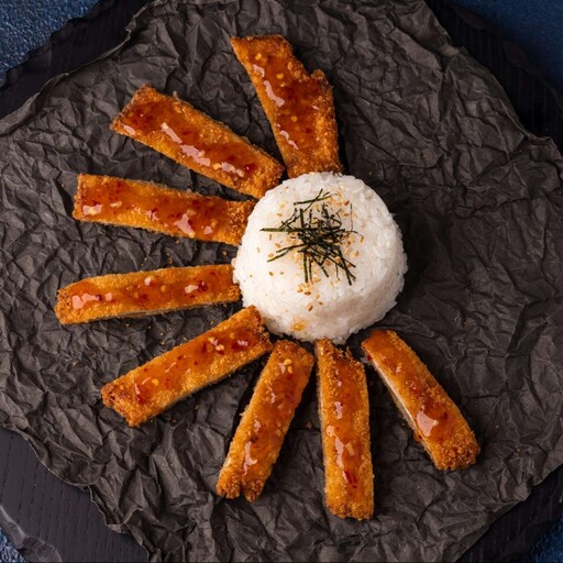 Карбонат, рис, соевый соус, паприка копчёная, сахар, соль, перец черный, панко, нори, кунжут, кисло-сладкий соус.