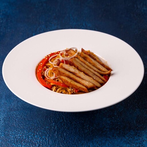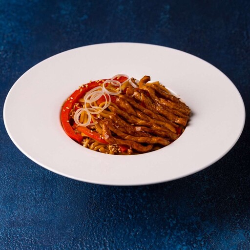 Лапша удон, Соус фирменный, Куриная грудка, Болгарский перец, Лук порей, Кунжут