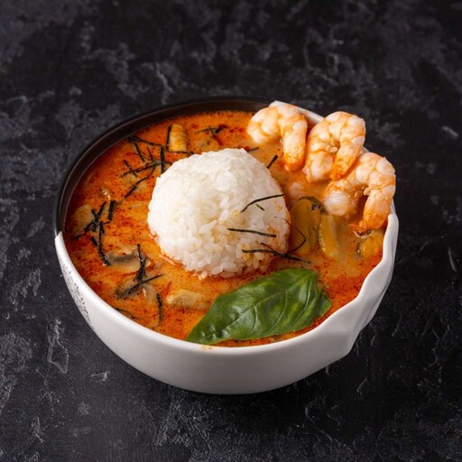 🥢 Креветки нарезанные, Кальмар, Шампиньоны терияки, Кокосовое молоко, Томаты черри, Лемонграсс, Куриный бульон, Тайские специи и приправы, Рис