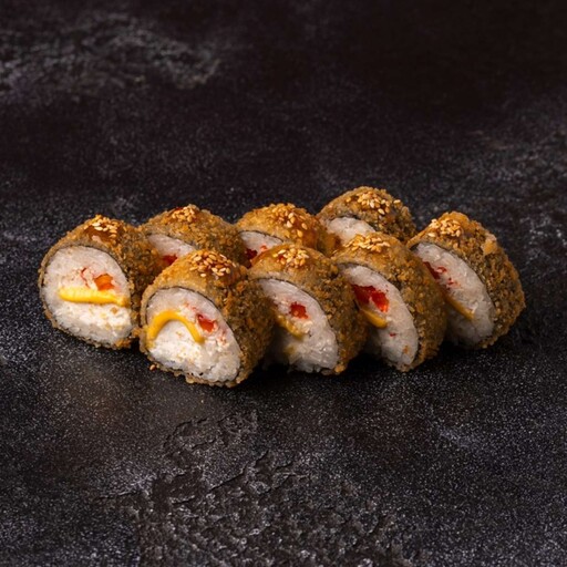 Рис, нори, кляр, панко, сыр творожный, краб, огурец, оранжевая масаго, унаги соус, кунжут
