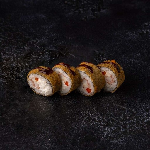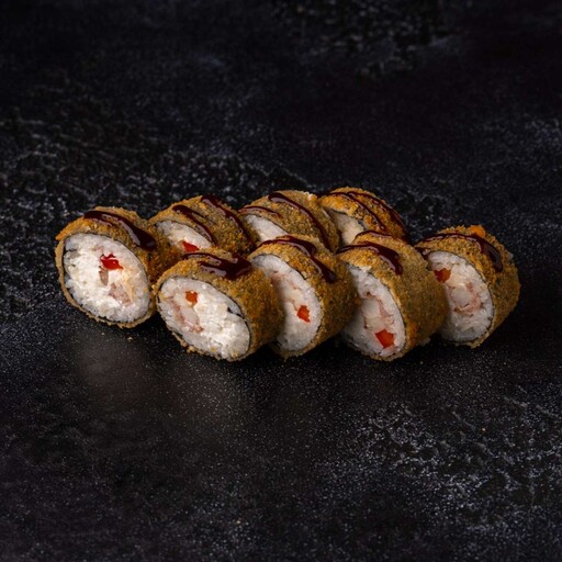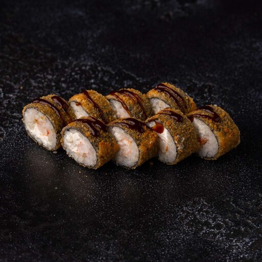 Рис, нори, кляр, панко, сыр творожный, масаго, креветка, унаги соус, кунжут