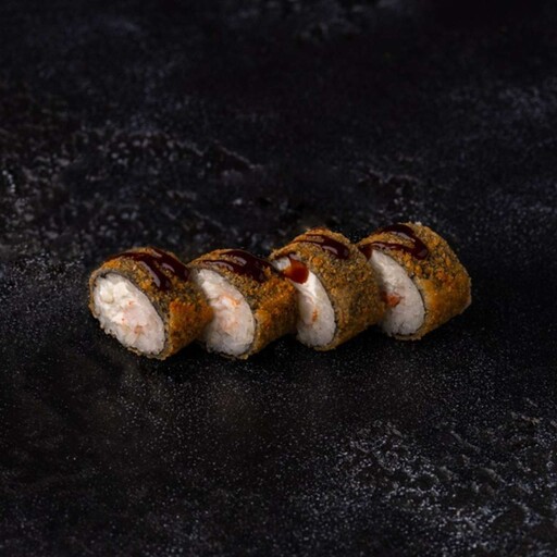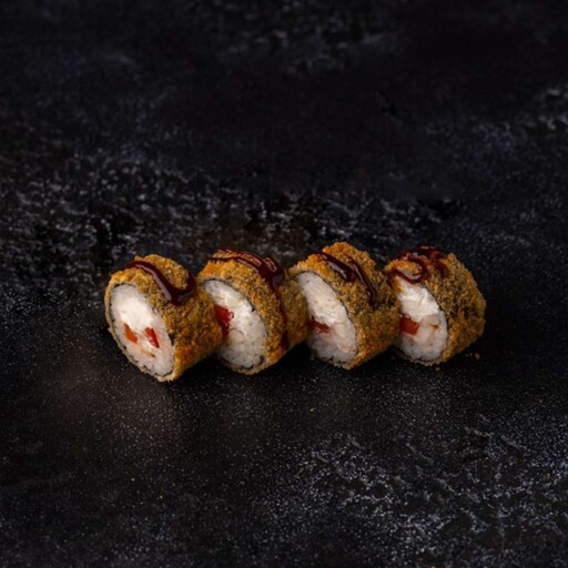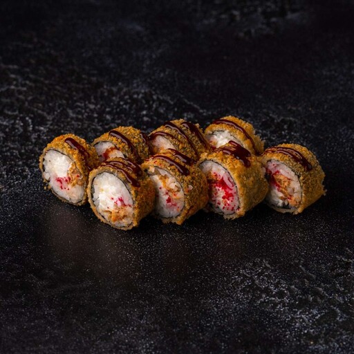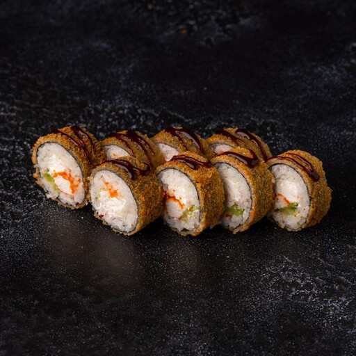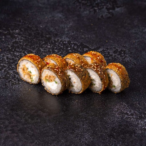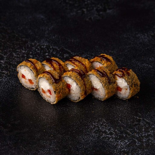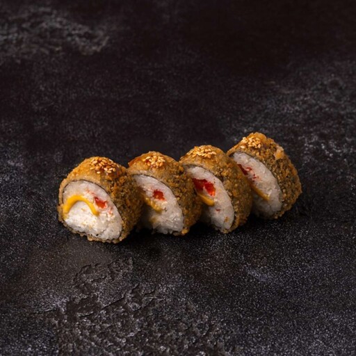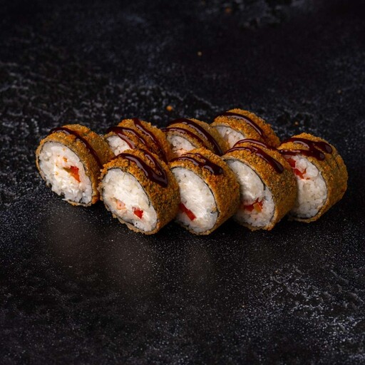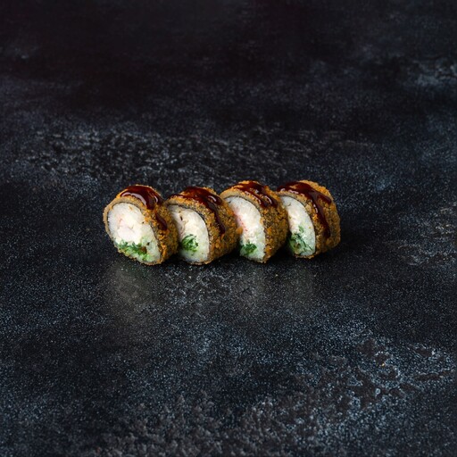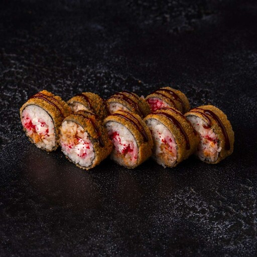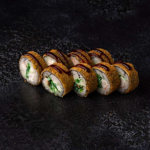 Рис, нори, кляр, панко, сыр творожный, краб, огурец, унаги соус, кунжут