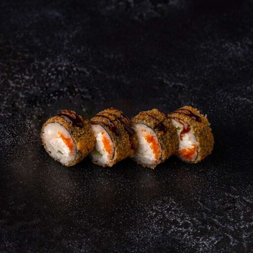 Рис, нори, кляр, панко, сыр творожный, жаренный лосось, масаго, унаги соус, кунжут